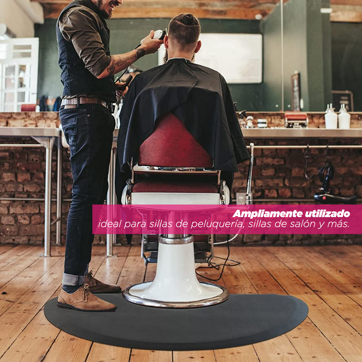 Su forma circular permite una perfecta adaptación a sillas de corte o sillones de barbero con base circular o de estrella, garantizando estabilidad y un ajuste ideal. Gracias a su construcción resistente, el tapete conserva su forma original de manera permanente, incluso con el uso diario y constante movimiento de las sillas.