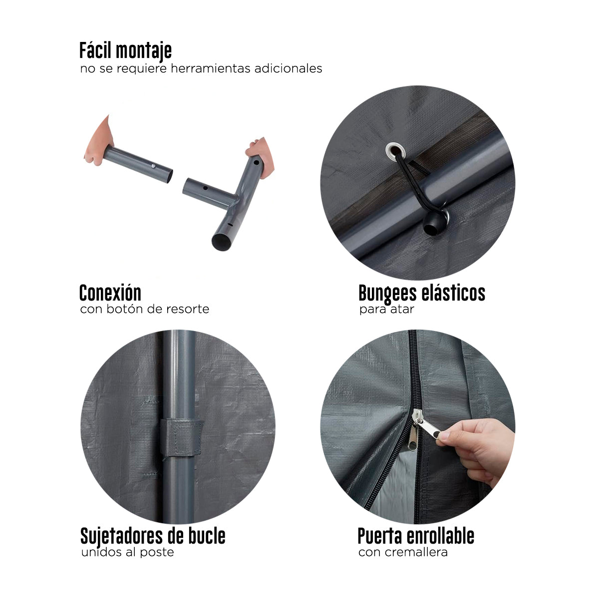 Diseño multi-estabilidad: conector con soldadura artística, correa elástica de bola que sujeta el toldo al marco, viene con estacas de tierra y cuerdas tensoras para un apoyo adicional. Mantén tus pertenencias seguras.